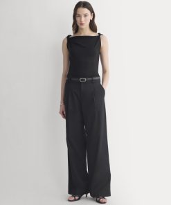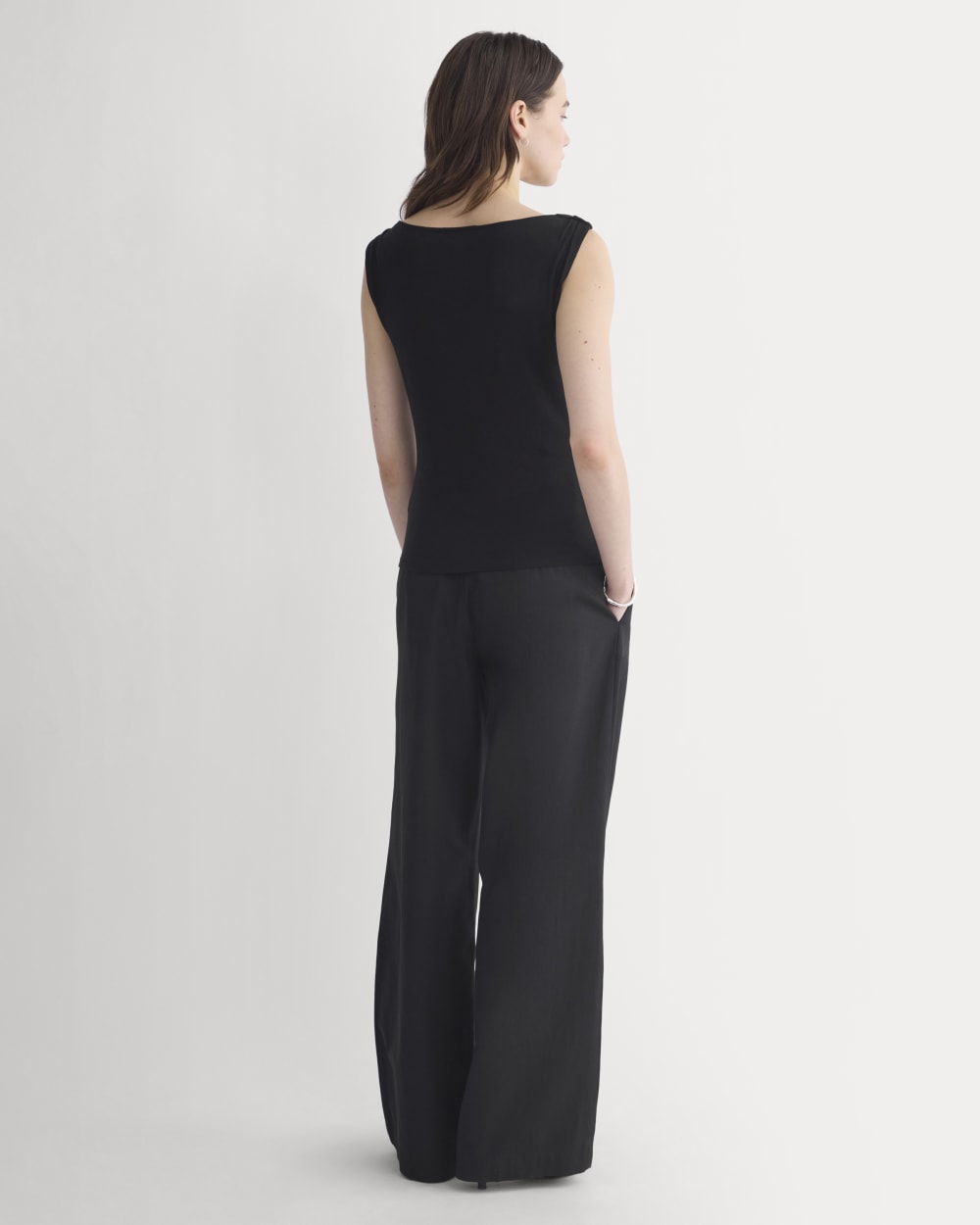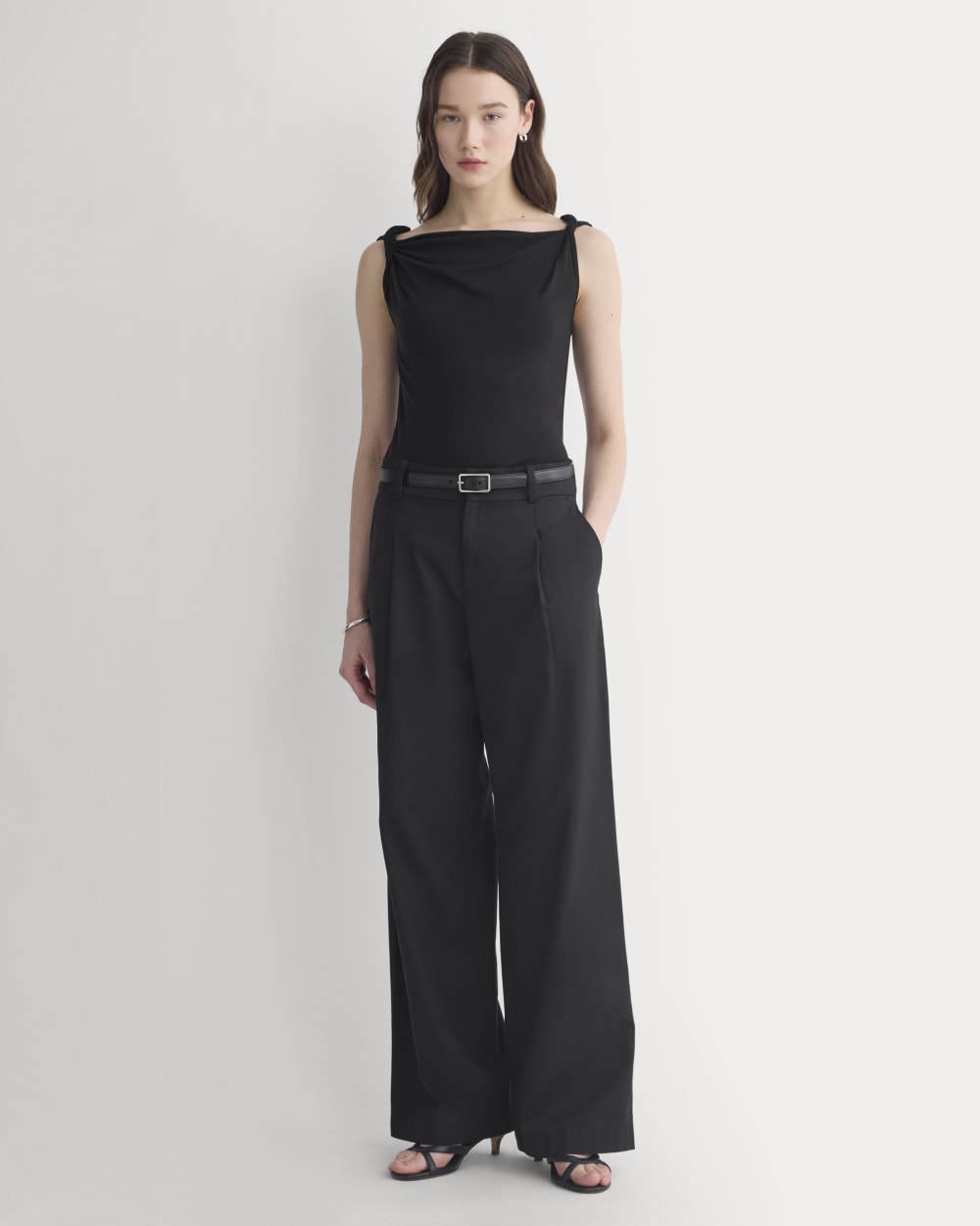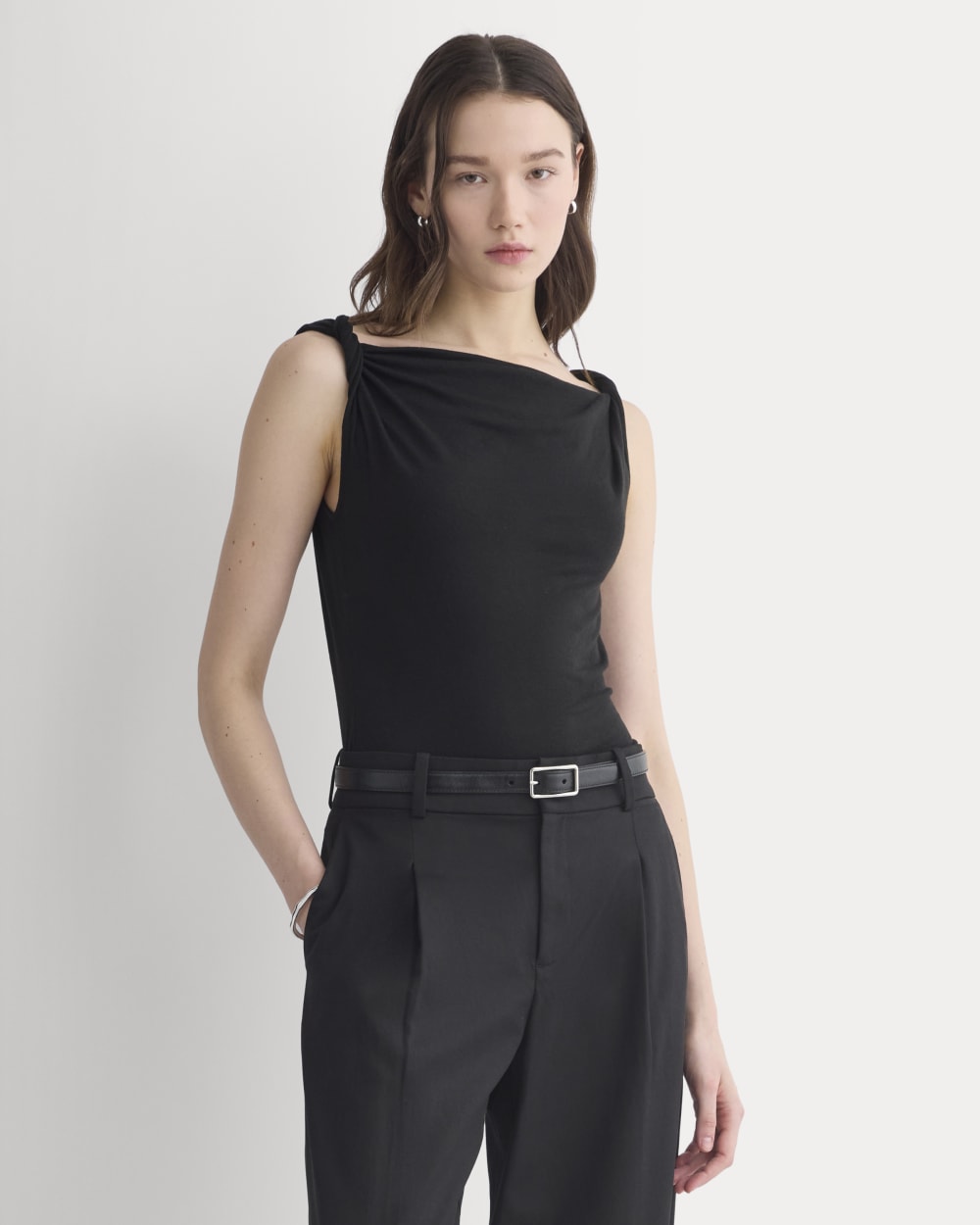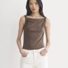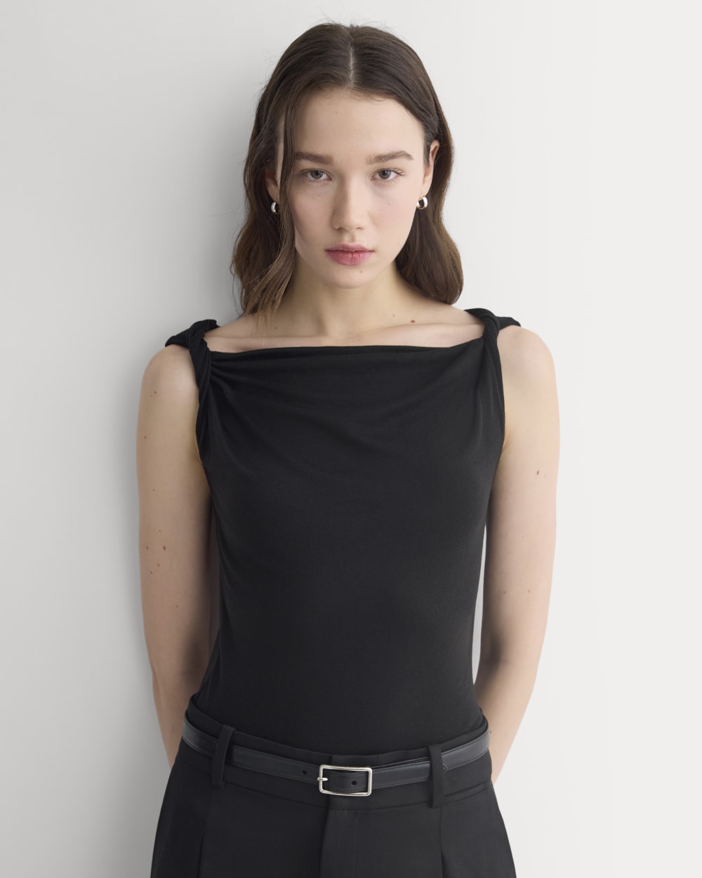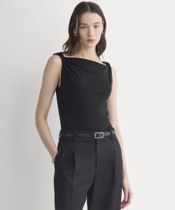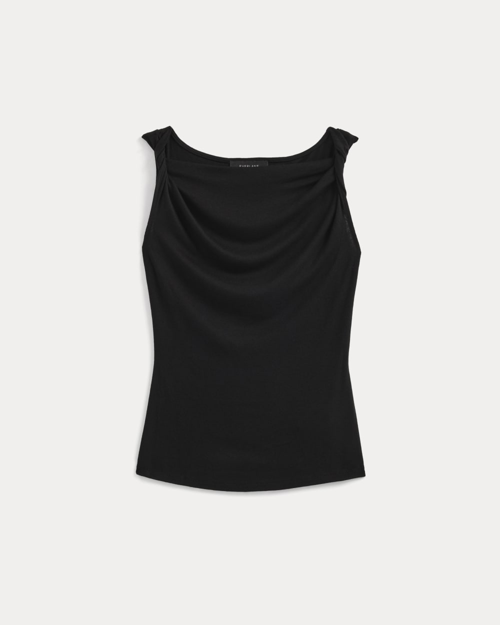 This tank features a draped cowl neckline created by a twisted shoulder detail. The slim fit keeps the silhouette clean, while the soft knit adds just enough structure to hold the shape. It’s an easy piece to dress up for summer evenings—just add trousers or a skirt for dinner and drinks.