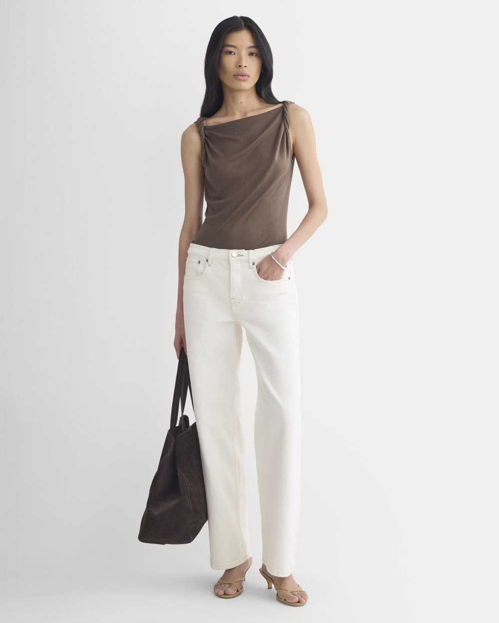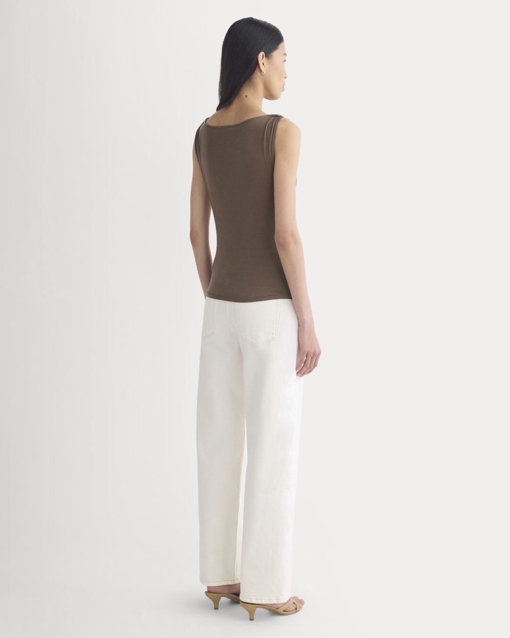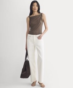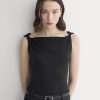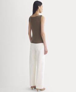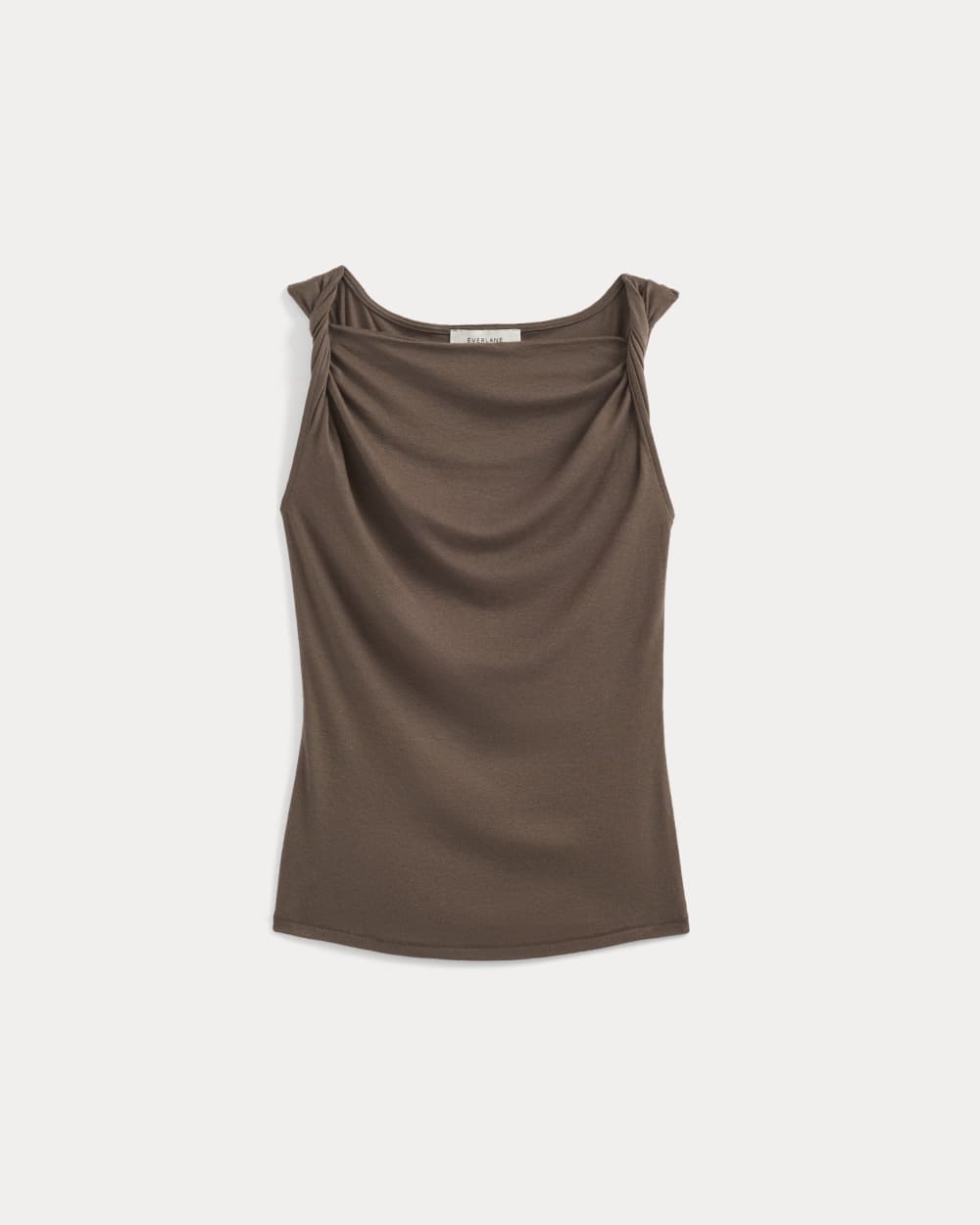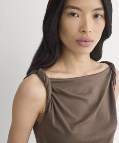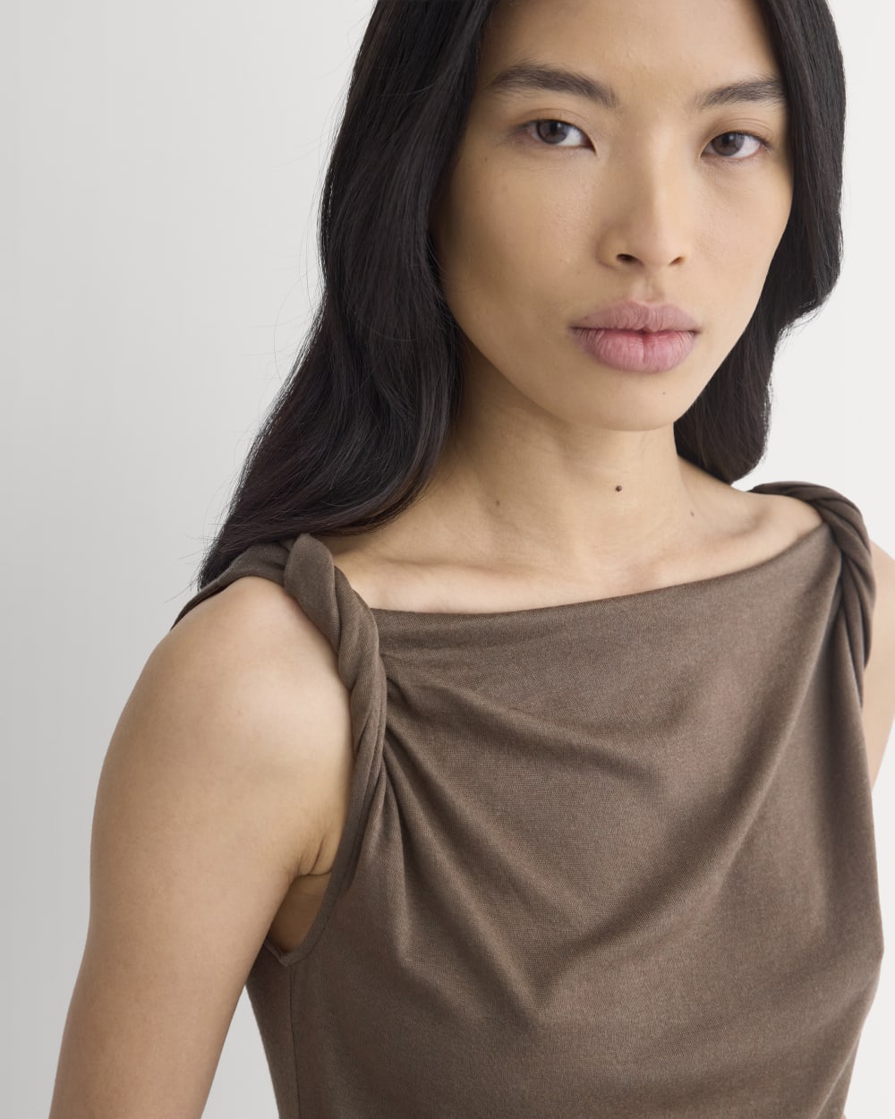 This tank features a draped cowl neckline created by a twisted shoulder detail. The slim fit keeps the silhouette clean, while the soft knit adds just enough structure to hold the shape. It’s an easy piece to dress up for summer evenings—just add trousers or a skirt for dinner and drinks.