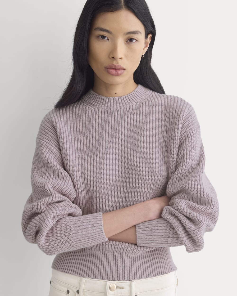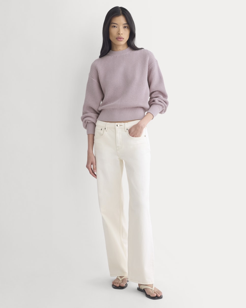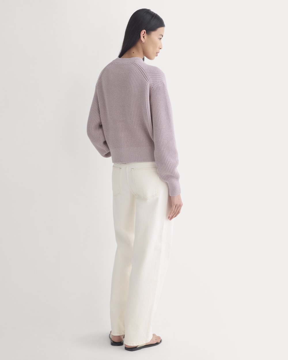 A chunky ribbed crew with dropped shoulders, subtle sleeve volume, and a snug hem that pairs perfectly with high-rise bottoms. Made from 100% organic cotton, it’s cozy without feeling heavy.